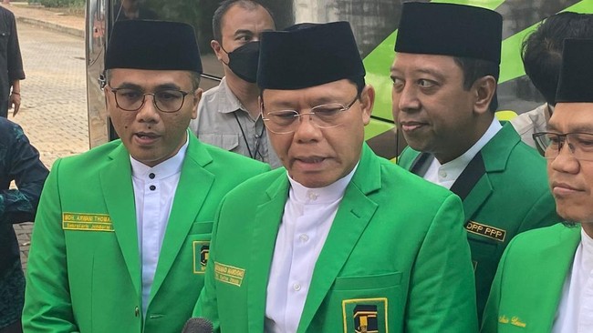 Pantauan detikcom, rombongan petinggi PPP tiba di Kompleks Istana Kepresidenan, Jakarta Pusat, sekitar pukul 16.00 WIB, Kamis (4/5/2023). Mereka tiba menggunakan bus berwarna hijau. Rombongan PPP itu juga kompak mengenakan jas hijau seragam PPP.