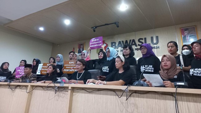 "Masyarakat Peduli Keterwakilan Perempuan menyatakan menolak Pasal 8 Ayat (2) PKPU Nomor 10 Tahun 2023 karena melanggar UUD negara Republik Indonesia Tahun 1945 dan UU Pemilu dan mematikan upaya peningkatan keterwakilan perempuan dalam pencalonan DPR dan DPRD," ujar Aktivis Perempuan Valentina Sagala di kantor Bawaslu RI, Jakarta Pusat, Senin (8/5/2023).