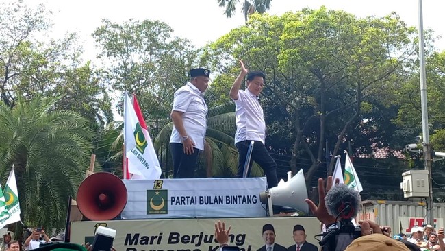 Yusril tampak menaiki mobil komando. Mereka tampa membawa atribut berupa bendera PKB. Sekjen PBB Afriansyah Noor juga ikut dalam rombongan.