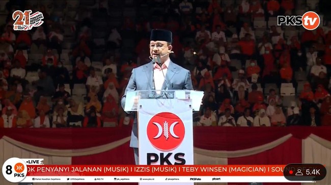 Bakal capres Koalisi Perubahan untuk Persatuan, Anies Baswedan, menyampaikan pidato politik saat acara Milad PKS ke -21 di Istora Senanyan, Jakarta. Dalam sambutannya ia sempat menyinggung soal pejabat yang membuat aturan untuk kepentingannya sendiri.