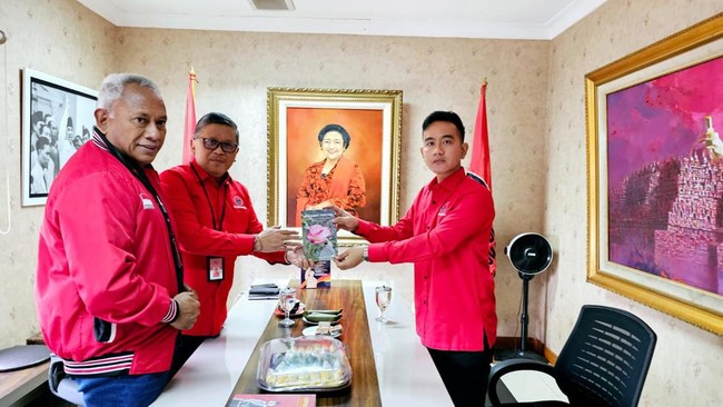 Dalam keterangan tertulis PDIP, Senin (22/5/2023), didampingi Ketua Bidang Kehormatan PDIP Komarudin Watubun, pertama Hasto mrnyerahkan buku tentang geopolitik Sukarno berjudul berjudul Progressive Geopolitical Coexistence ke Gibran.