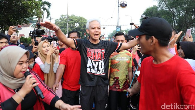 Ganjar lantas menjawab sindiran itu dengan menunjukkan kaus yang dipakainya. Diketahui kaus Ganjar bertuliskan 'Kalau Mau Sehat, Ayo Olahraga.