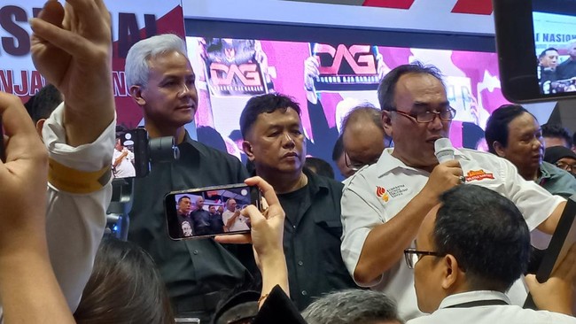 Bakal calon presiden (bacapres) dari PDIP Ganjar Pranowo menghadiri acara deklarasi nasional relawan Joko Widodo (Jokowi) mendukung dirinya. Kehadiran Ganjar disambut teriakan presiden oleh para relawan.