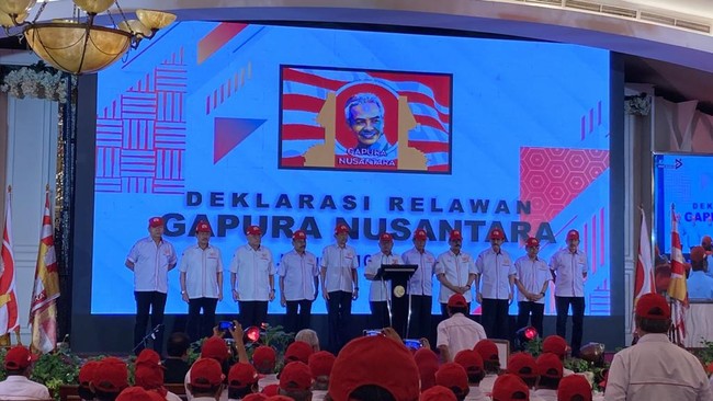 Ratusan relawan Gapura Nusantara mendeklarasikan dukungan kepada Ganjar Pranowo sebagai calon presiden (capres) di Pemilu 2024. Acara deklarasi itu dihadiri langsung oleh Ganjar.