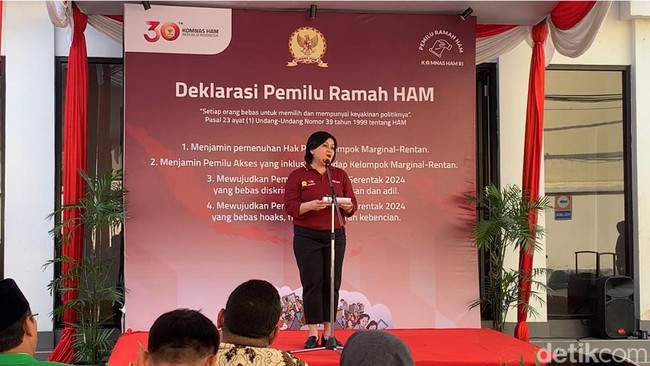 "Deklarasi pemilu ramah HAM inisiasi Komnas HAM hari ini, adalah salah satu langkah komnas HAM yang secara responsif juga ingin turut membuktikan pemenuhan hak-hak kepemiluan setiap warga negara," ujar Ketua Komnas HAM Atnike Nova Sigiro dalam penyampaiannya di acara tersebut di Komnas HAM, Jalan Latuharhary, Jakarta Pusat, Minggu (11/6/2023).
