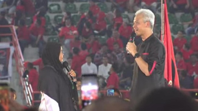 Ada momen menarik dalam sambutan Ganjar. Ganjar tiba-tiba mengajak seorang ibu naik ke atas panggung. Dia memberikan tawaran hadiah.