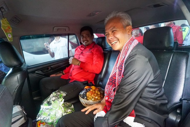 Keduanya pun tampak satu mobil menuju Gedung Serba Guna Provinsi Sumut, Deliserdang. Ganjar yang turun dari mobil didampingi Bobby di sampingnya.