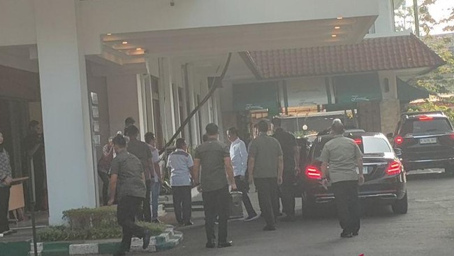 Tepat pukul 16.00 WIB, rombongan Presiden Jokowi memasuki lobi hotel pintu samping. Jokowi terlihat mengenakan kemeja putih, celana hitam, dan sepatu putih hitam yang sering digunakan.