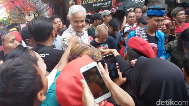 Banyak warga yang berebut untuk mengabadikan kedatangan Ganjar. Mereka juga rela berdesakan demi berfoto bersama capres usungan PDIP itu.