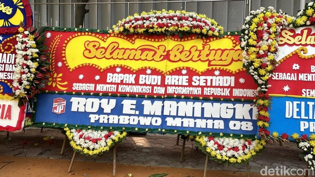 "Selamat bertugas Bapak Budi Arie Setiadi sebagai Menteri Komunikasi dan Informatika Republik Indonesia," bunyi tulisan karangan bunga dari Relawan Prabowo Mania 08.