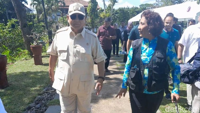 Menteri Pertahanan (Menhan) sekaligus Ketum Partai Gerindra Prabowo Subianto mengunjungi eks Menteri Kelautan dan Perikanan (KKP) Susi Pudjiastuti di Pangandaran, Jawa Barat. Usai melakukan kegiatan, Susi menjamu Prabowo di kediamannya bicara empat mata kurang lebih satu jam.