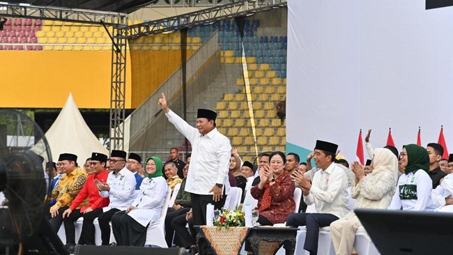 Prabowo yang mengenakan pakaian berwarna putih dan berpeci hitam itu pun kemudian bergegas berdiri seraya memberikan salam kepada para hadirin yang datang memenuhi Stadion Manahan Solo, Jawa Tengah.