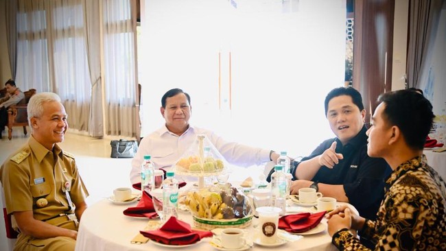 Menteri Pertahanan RI Prabowo Subianto mengunggah momen sarapan bareng Gubernur Jawa Tengah Ganjar Pranowo, Menteri BUMN Erick Thohir dan Wali Kota Solo Gibran Rakabuming. Prabowo mengungkapkan suasana saat mereka berkumpul sembari menunggu Presiden RI Joko Widodo.
