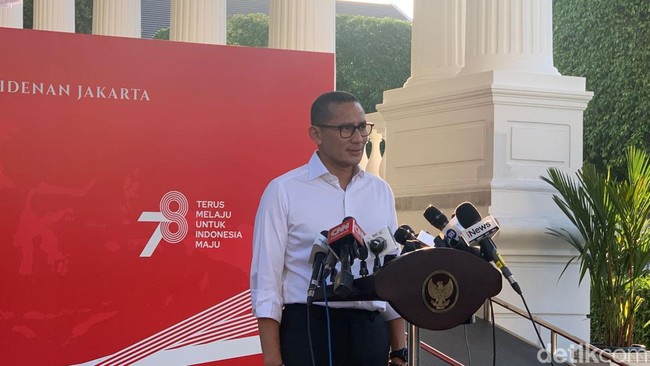 "Tadi ketemu Pak Prabowo juga, papasan keluar, ini masing-masing bisa kita formulasikan dalam sebuah program kerja dalam bentuk gagasan yang ditawarkan kepada pemilih nanti di Februari 2024," kata Sandiaga kepada wartawan, di Istana Merdeka, Jakarta, Selasa (1/8/2023). Sandiaga dalam posisi hendak meninggalkan Istana.