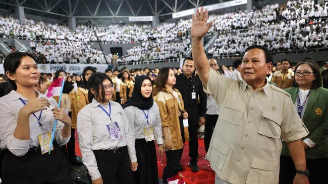 Prabowo yang hadir mengenakan baju safari disambut riuh mahasiswa sejak muncul di pintu utama. Keriuhan dan tepuk tangan mereka mengantar Prabowo hingga panggung utama.