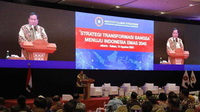 "Jokowinomics adalah aplikasi nyata dari ekonomi Pancasila yang bisa kita gunakan untuk mencapai Indonesia Emas 2045," kata Prabowo, dalam acara seminar ekonomi yang diselenggarakan Universitas Kebangsaan Republik Indonesia di Ballroom Hotel Bidakara, Jakarta, Selasa (15/8/2023).