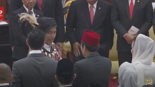 Jokowi, yang sudah bersalaman dengan beberapa anggota DPR, lanjut berjalan ke arah anggota DPR dari Fraksi Gerindra hingga PKS. Jokowi mulanya disalami Waketum Gerindra Sugiono hingga Koordinator Juru Bicara Gerindra Budi Djiwandono. Jokowi terlibat perbincangan dengan Budi Djiwandono.