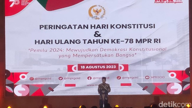 Pernyataan itu disampaikan Jokowi dalam peringatan Hari Konstitusi dan hari ulang tahun ke-78 MPR RI, Jumat (18/8/2023). Jokowi mulanya berbicara mengenai kondisi dunia yang sering tidak terduga dan penuh dengan ketidakpastian.