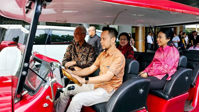 Pantauan detikcom di Royal Ambarukmo Yogyakarta, Jalan Laksda Adisutjipto No. 62, Selasa (22/8/2023), Megawati dan Ganjar tampak hadir ke lokasi menggunakan mobil listrik. Relawan yang menunggu menyambut dengan meriah.