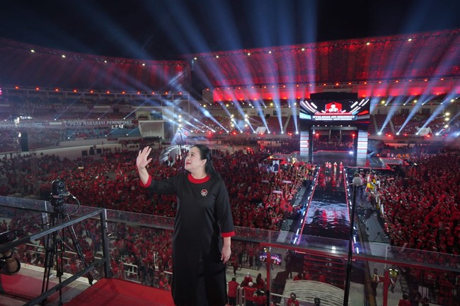 Puan Maharani yang juga Ketua DPR RI ini terus mengangkat tongkat itu saat mulai berbicara. Dia menyerukan semua kader di Stadion ini untuk memenangkan PDIP di Pemilu 2024.