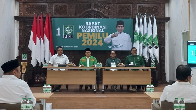 Ketum PKB Muhaimin Iskandar atau Cak Imin membuka Rapat Koordinasi Nasional (Rakornas) PKB Pemilu 2024. Dalam arahannya, Cak Imin meminta jajarannya untuk tidak mengevaluasi terkait pilpres terlebih dulu.