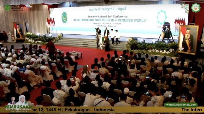 Momen itu terjadi selepas Presiden Joko Widodo (Jokowi) menyampaikan sambutan dalam acara Muktamar Sufi Internasional yang ditayangkan lewat YouTube World Sufi Assembly, Selasa (29/8/2023). Jokowi awalnya maju ke panggung untuk melakukan pemukulan beduk sebagai tanda peresmian pembukaan acara itu.