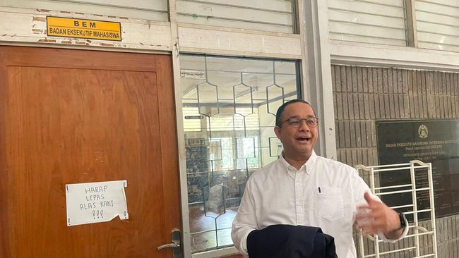 Bacapres Koalisi Perubahan untuk Persatuan (KPP) Anies Baswedan bersilaturahmi ke Sekretariat BEM UI. Selain silaturahmi, kedatangan Anies juga untuk mengambil undangan debat.
