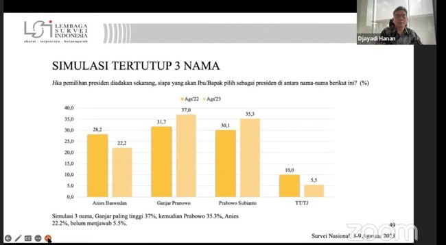 "Simulasi 3 nama, Ganjar paling tinggi 37 persen, kemudian Prabowo 35,3 persen, Anies 22,2 persen dan belum menjawab 5,5 persen," ujar Direktur Eksekutif LSI Djayadi Hanan dalam keterangan tertulis, Rabu (30/8/2023).