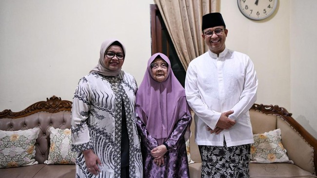 Anies yang mengenakan baju koko putih dan peci hitam didampingi istrinya, Fery Farhati, saat sowan ke kediaman Muhassonah. Kedatangan Anies untuk bersilaturahmi dan meminta doa.