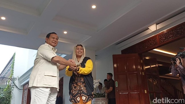 Prabowo langsung menyambut kedatangan Yenny. Keduanya bersalaman terlebih dahulu sebelum masuk ke dalam kediaman Prabowo.