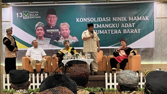 Dukungan itu diungkap pada konsolidasi ninik mamak pemangku adat Sumbar, di Pangeran Beach Hotel, Sabtu (9/9/2023). Dukungan itu turut disaksikan Ketua Umum PBB Prof Yusril Ihza Mahendra dan Sekjen PBB Afriansyah Noor, Ketua DPD Partai Gerindra Sumbar dan Ketua DPW PBB Sumbar Zaldi Heriwan.