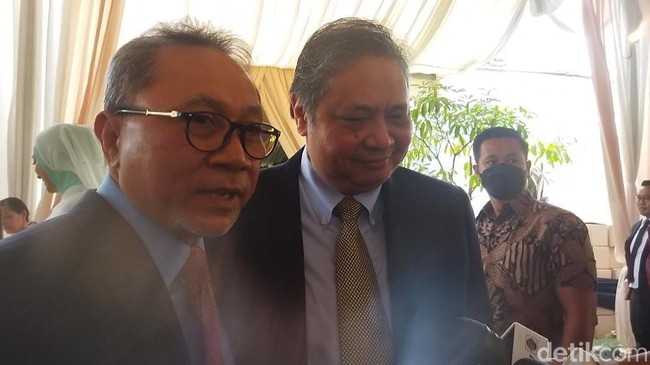 Ketua Umum Partai Golkar Airlangga Hartarto bersama Ketua Umum PAN Zulkifli Hasan (Zulhas) menghadiri resepsi pernikahan putra Hotman Paris Hutapea. Keduanya kompak memakai setelan jas hitam beserta kemeja berkelir biru.