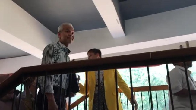 Pantauan detikcom, Senin (18/9/2023), Ganjar tiba di lokasi acara sekitar pukul 08.45 WIB. Ganjar tampak mengenakan kemeja bergaris hitam putih.