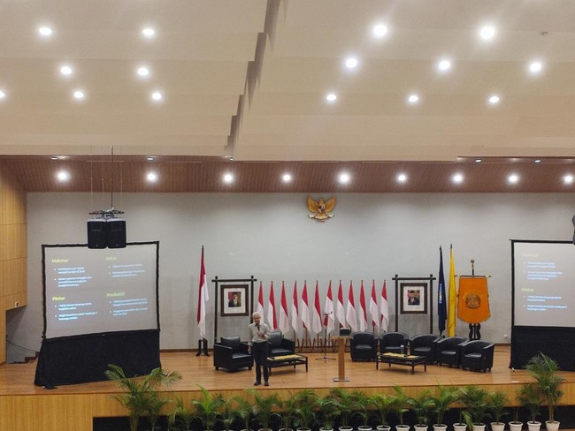 Mahasiswa jurusan Ilmu Politik FISIP UI, Naufal, melontarkan pertanyaan kepada bakal calon presiden (bacapres) Ganjar Pranowo jika nanti terpilih sebagai presiden, akan jadi petugas partai atau petugas rakyat. Apa jawab Ganjar?