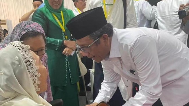 Dilihat detikcom, momen itu diunggah Mahfud pada Senin (18/9/2023) siang. Dari foto tersebut, Mahfud yang memakai baju putih dan celana hitam tampak membungkukkan badan. Dia bersalaman dan terlihat berbincang dengan Sinta Nuriyah.