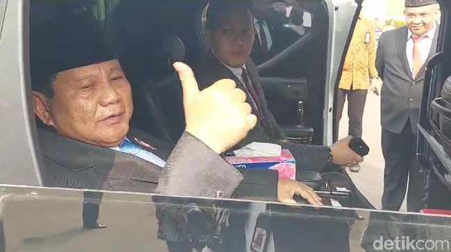 Ketua Umum (Ketum) Partai Gerindra Prabowo Subianto kembali menjawab soal peluang duet dengan bacapres PDIP Ganjar Pranowo. Prabowo mengacungkan jempol saat menjawab itu.