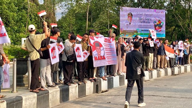 Para muda-mudi yang mengatasnamakan Relawan Gibran Kalbar (RAKA) berkumpul di Bundaran Digulis Untan Pontianak. Mereka melakukan deklarasi mendukung Wali Kota Solo Gibran Rakabuming Raka menjadi calon wakil presiden 2024.