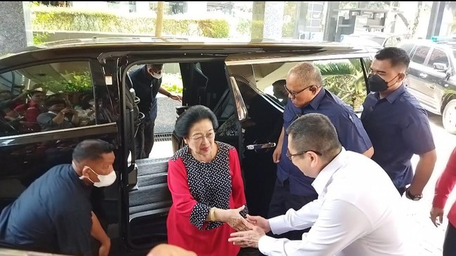 Pantauan detikcom, Rabu (11/10/2023), Megawati yang mengenakan pakaian merah tiba di gedung High End, pukul 14.30 WIB. Tampak Megawati disambut Ketum Perindo Hary Tanoesoedibjo.