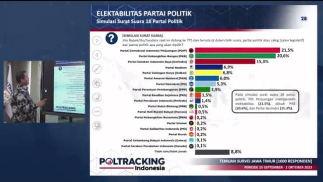 "Elektabilitas partai politik di Jawa Timur. Pada simulasi surat suara 18 partai politik, PDI Perjuangan memperoleh elektabilitas (21,5%), diikuti PKB (20,6%), Partai Gerindra (15,3%), Partai NasDem (6,9%), Partai Golkar (6.8%), PAN (6%), Partai Demokrat (5,3%), PPP (3,9%), PKS (1,5%), dan Perindo (1,4%), sementara partai politik lainnya masih di bawah 1 persen," tulis Poltracking Indonesia dalam keterangannya, Rabu (11/10/2023).