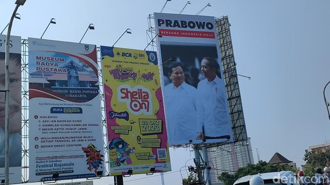 Baliho bergambar bakal calon presiden (capres) Prabowo Subianto dan Presiden Joko Widodo (Jokowi) kembali mejeng di flyover Manahan, Solo. Baliho itu terpampang di sisi timur flyover Manahan.