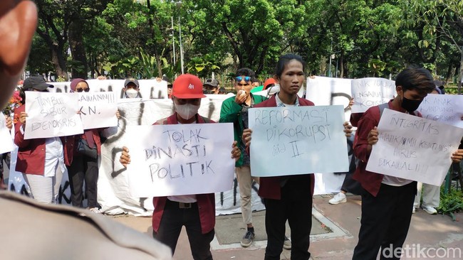 Para pengunjuk rasa juga terlihat memegang spanduk besar dengan tulisan 'Tolak Dinasti Politik', 'Lawan KKN' hingga 'Integritas Mahkamah Konstitusi Harus Dikawal'.