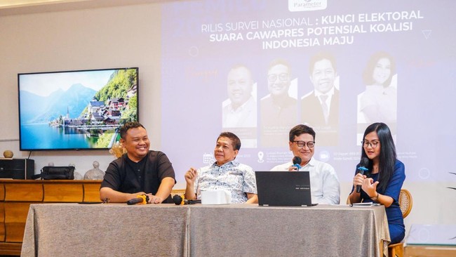 Hal itu dia sampaikan saat paparan hasil survei nasional dengan tema 'Kunci Elektoral Suara Cawapres Potensial Koalisi Indonesia Maju' di Jakarta Selatan pada Minggu (15/10) kemarin.