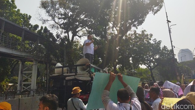 Pantauan detikcom di lokasi, Senin (16/10/2023) pukul 09.00 WIB, terlihat Ketua DPC Gerindra Jakarta Timur Ali Lubis ikut berorasi di atas mobil komando. Seluruh massa aksi tampak kompak menggunakan baju bernuansa putih.