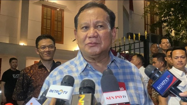 "Tenang aja, ojo kesusu (jangan terburu-buru), ojo grusa-grusu (jangan gegabah)," kata Prabowo kepada wartawan di Jalan Kartanegara, Jakarta Selatan, Selasa (17/10/2023).