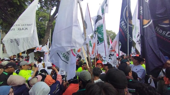 Pantauan detikcom di lokasi, Kamis (19/10/2023), pukul 07.42 WIB, tampak para relawan berkumpul di depan kantor KPU. Mereka tampak mengenakan berorasi di depan KPU.