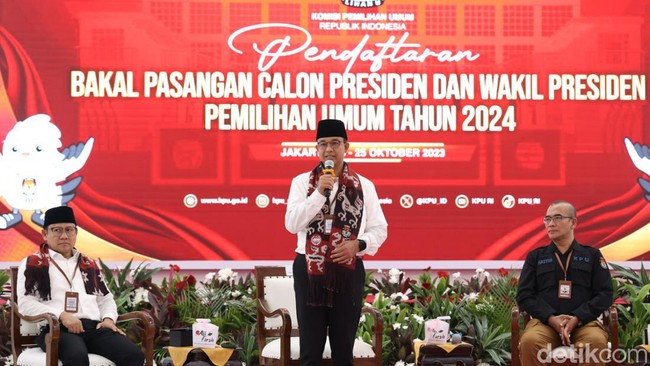 Hal ini disampaikan Anies dalam konferensi pers usai mendaftar sebagai capres bersama cawapres Cak Imin di KPU RI, Jalan Imam Bonjol, Menteng, Jakarta Pusat, Kamis (19/10/2023). Anies menyampaikan apresiasi kepada KPU RI yang telah menerima pendaftaranya.