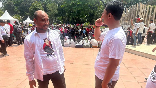 Pantauan detikcom di Tugu Proklamasi, Jakarta, Kamis (19/10/2023) tampak para relawan ada yang mengenakan kaos bertuliskan Golfud atau 'Golongan Mahfud' bergambar wajah Mahfud Md. Ada juga yang mengenakan baju bertuliskan Ganjar Pranowo-Mahfud Md 2024.