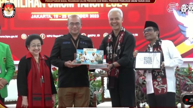 Visi misi itu diserahkan Ganjar dan Mahfud ke Ketua KPU RI Hasyim As'ary usai penyerahan berkas. Ganjar memegang buku pop up, sedangkan Mahfud memegang barcode.