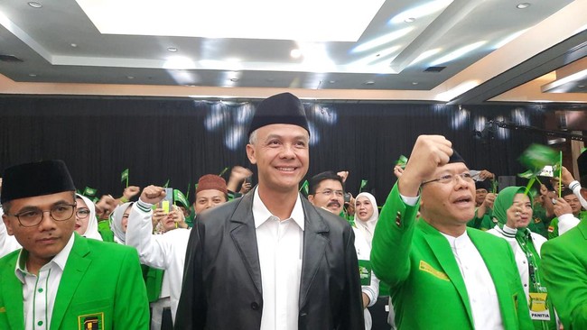 Ganjar hadir tanpa didampingi bacawapres Mahfud Md. Kedatangan Ganjar pun disambut dengan lantunan salawat oleh para peserta bimtek DPRD PPP.