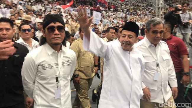 Bakal paslon Prabowo Subianto dan Gibran Rakabuming tiba di Indonesia Arena GBK, Senayan, Jakarta, sebelum menyambangi KPU RI. Para petinggi partai Koalisi Indonesia Maju (KIM), tokoh-tokoh, dan organisasi relawan menyambut Prabowo dan Gibran, di antaranya Habib Luthfi bin Yahya, Gus Miftah Sabri, dan Jenderal TNI (Purn) Wiranto.